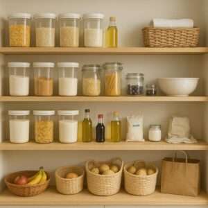 棚の一段一段がブロック要素、並べられた調味料のケースやカゴなどそれぞれがインライン要素です。