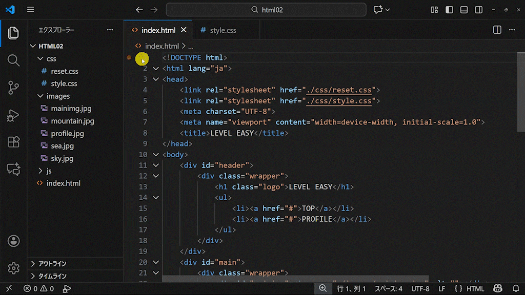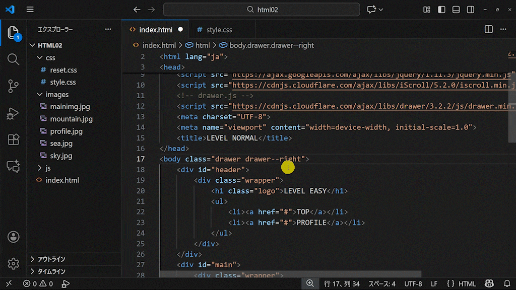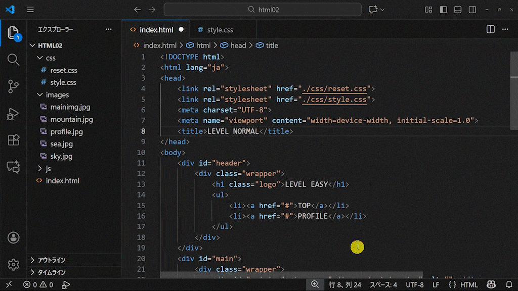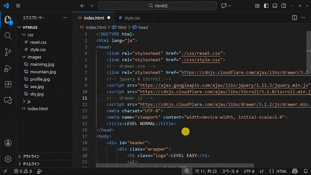 titleタグの文字列は「LEVEL NORMAL」に変更しましたが、headerタグの中のh1タグはまだ「LEVEL EASY」のままでしたよね。