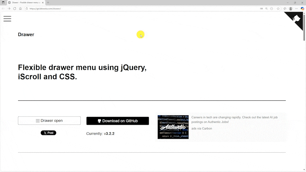 これで閲覧するのがPCでもスマホでも、ハンバーガーメニューをクリック(タップ)すればドロワーメニューが表示されます。