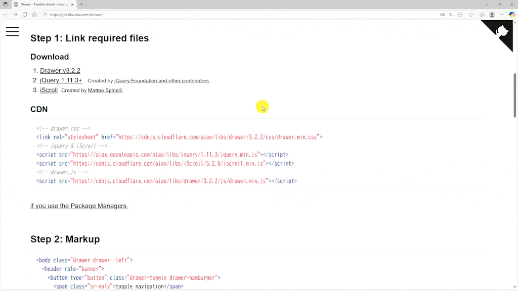 - Drawerのサイトの「Step 1: Link required files」の「CDN」にあるコードをコピーする。