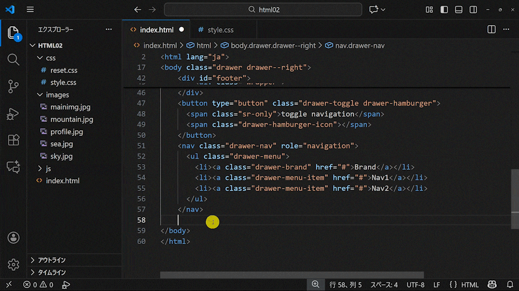 - 先ほど追記したnavタグの終了タグとbodyタグの終了タグの間を1行開け、