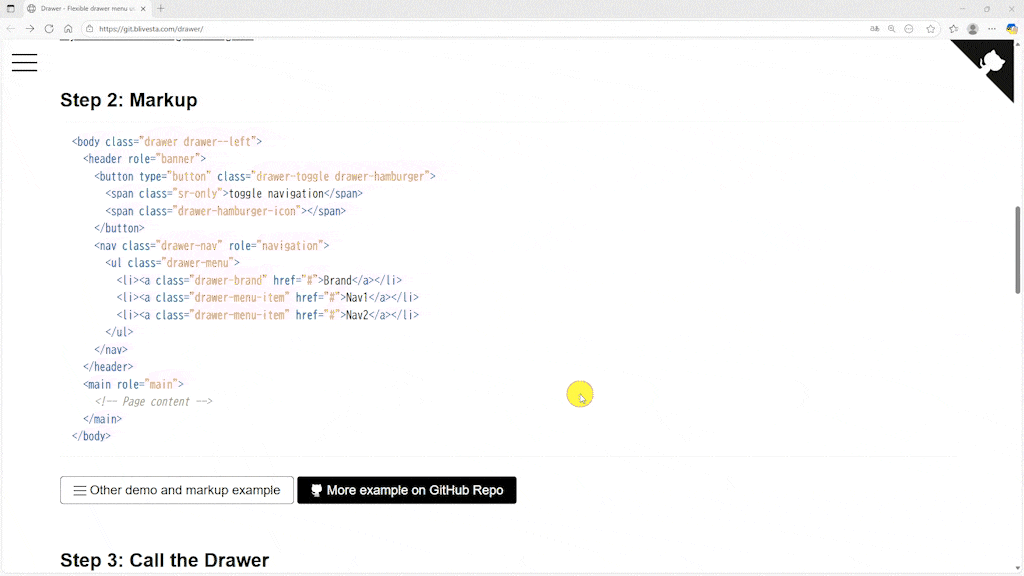 - Drawerのサイトの「Step 2: Markup」の<button>〜</button>および<nav>〜</nav>のコードをコピーする。※他のコード部分は不要です!