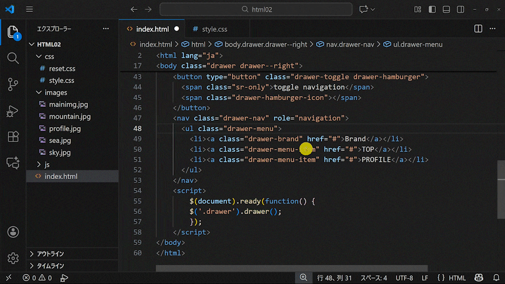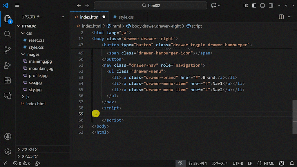 今度はハンバーガーメニューのbuttonタグ、そして開閉するドロワーメニューのnavタグを新たに追加しましょう。