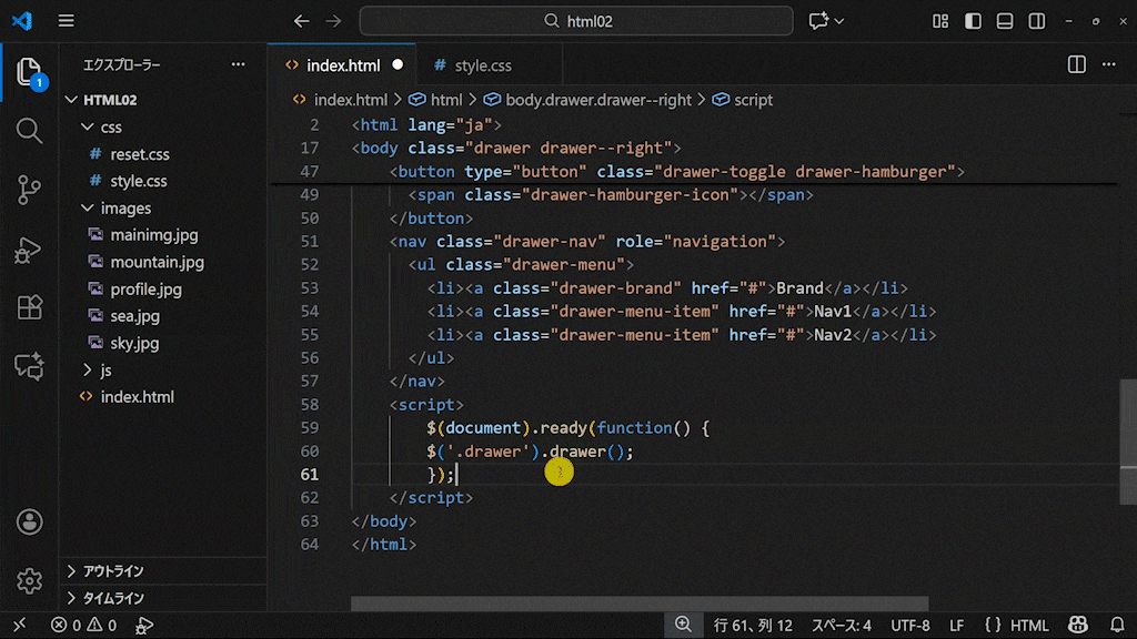 ※「drawer–right」の「drawer」と「right」の間のハイフンは2つです! - Ctrl + Sする。