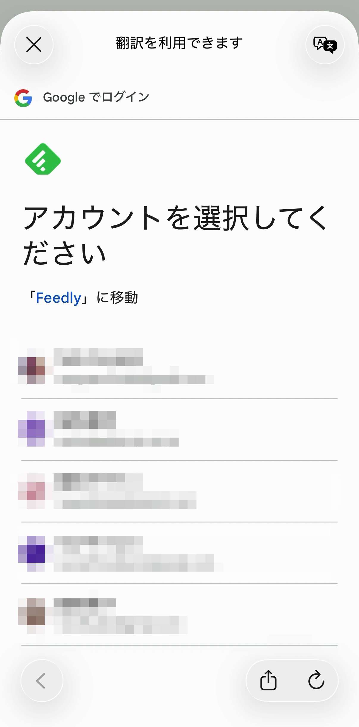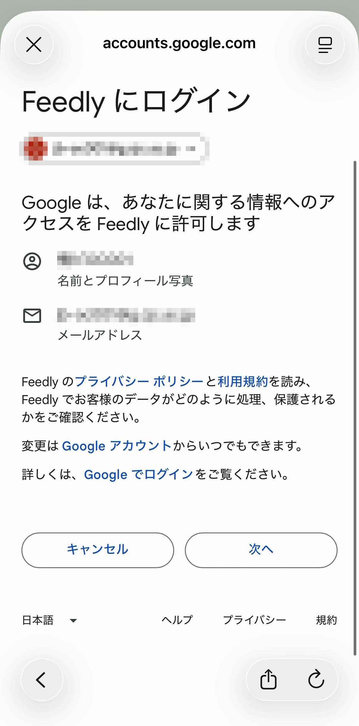 Feedlyにソーシャルログインの許可を行うか確認されるので、